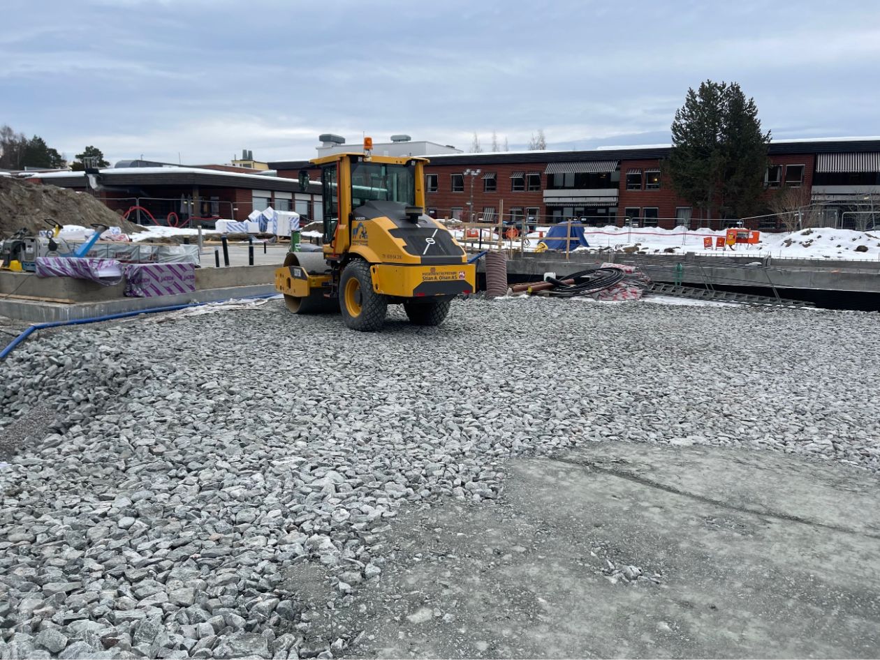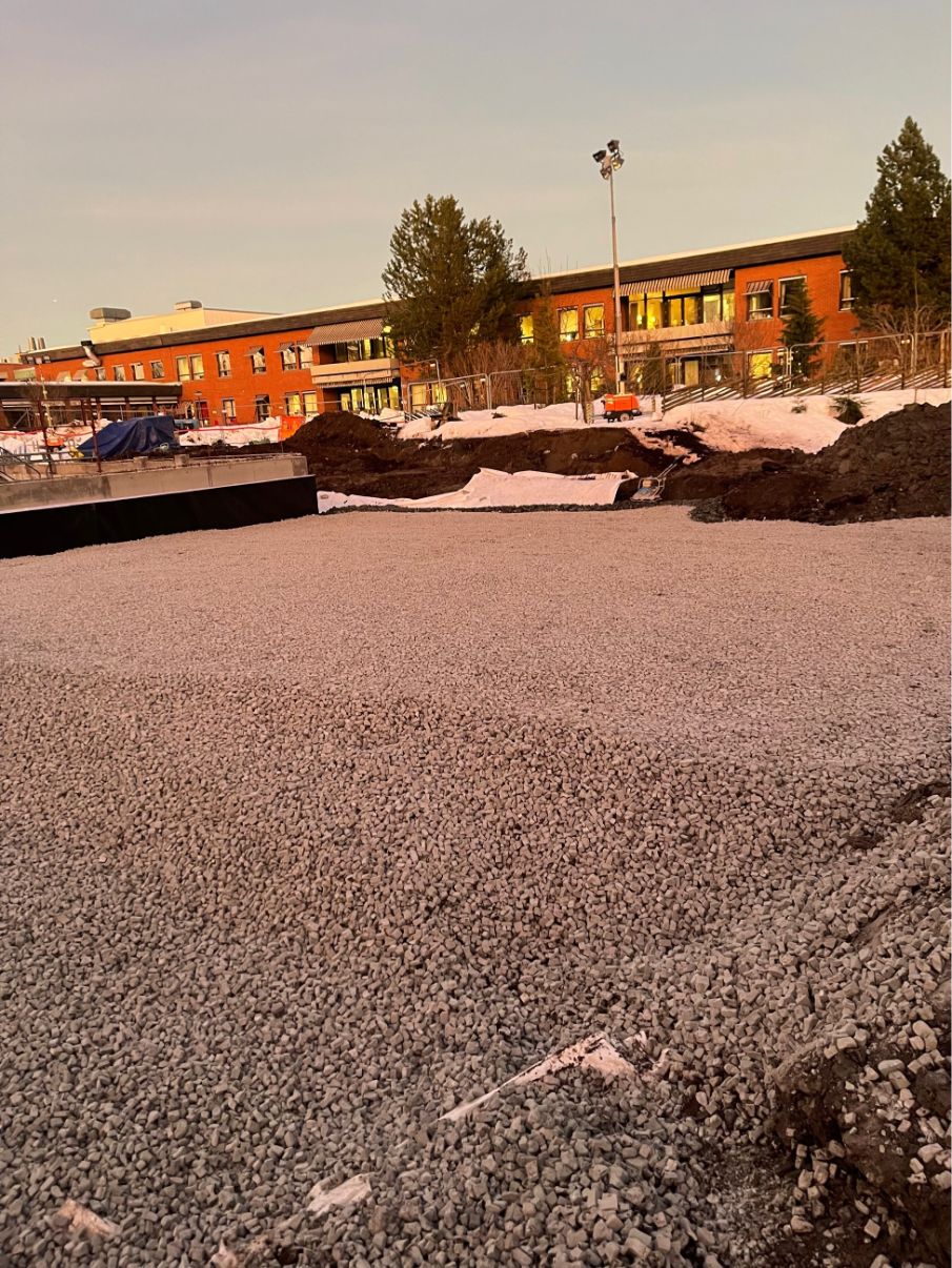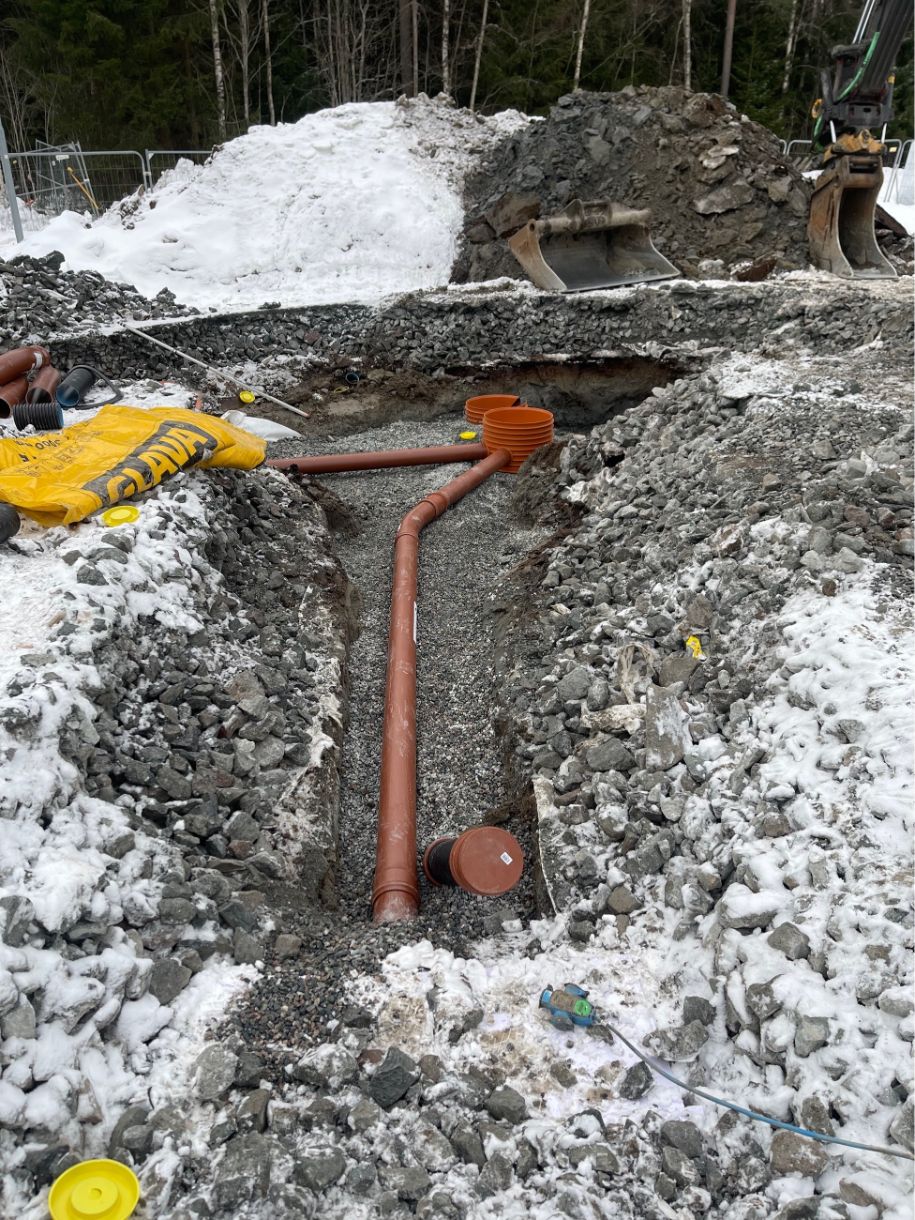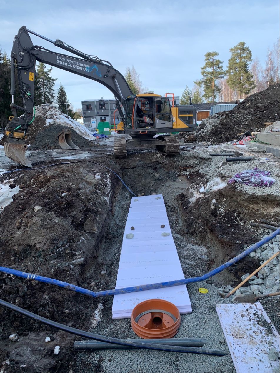 Vi har etablert komplett VA-anlegg med sandfang, overvannskummer, brannkummer og fordrøyningsanlegg. Grøfter for vann, overvann og spillvann ble gravd og tilbakefylt med pukk og sand. Ledninger ble tilkoblet kommunalt nett, og det ble utført trykktesting, kloring og kamerakjøring. Elektroarbeider inkluderte kabelgrøfter, lysmastfundamenter og ladesøyle. Fjernvarmegrøft ble etablert med isolering, og innmåling av VA-anlegg ble utført i henhold til kommunale krav.