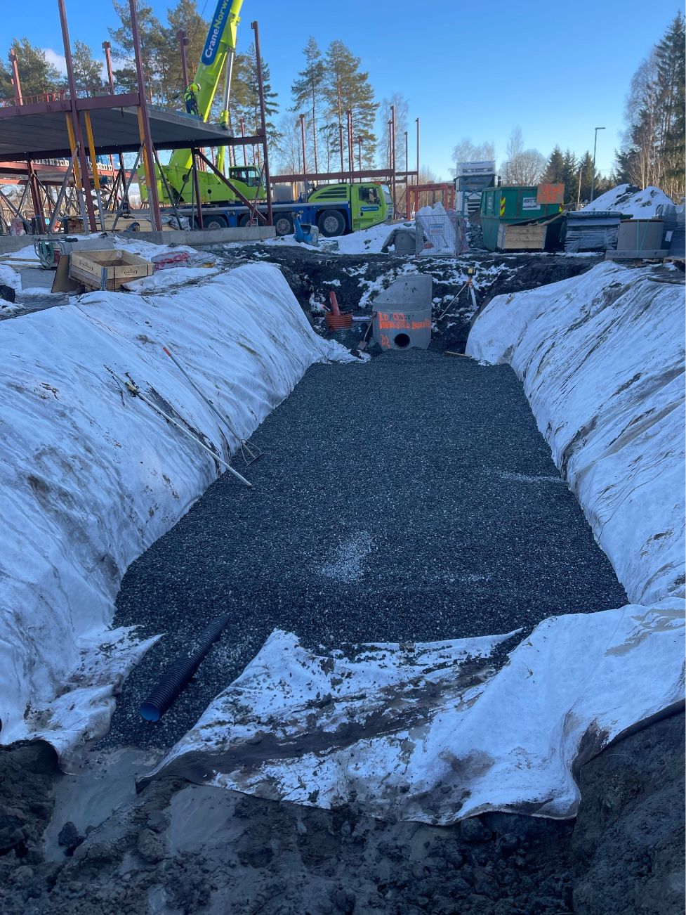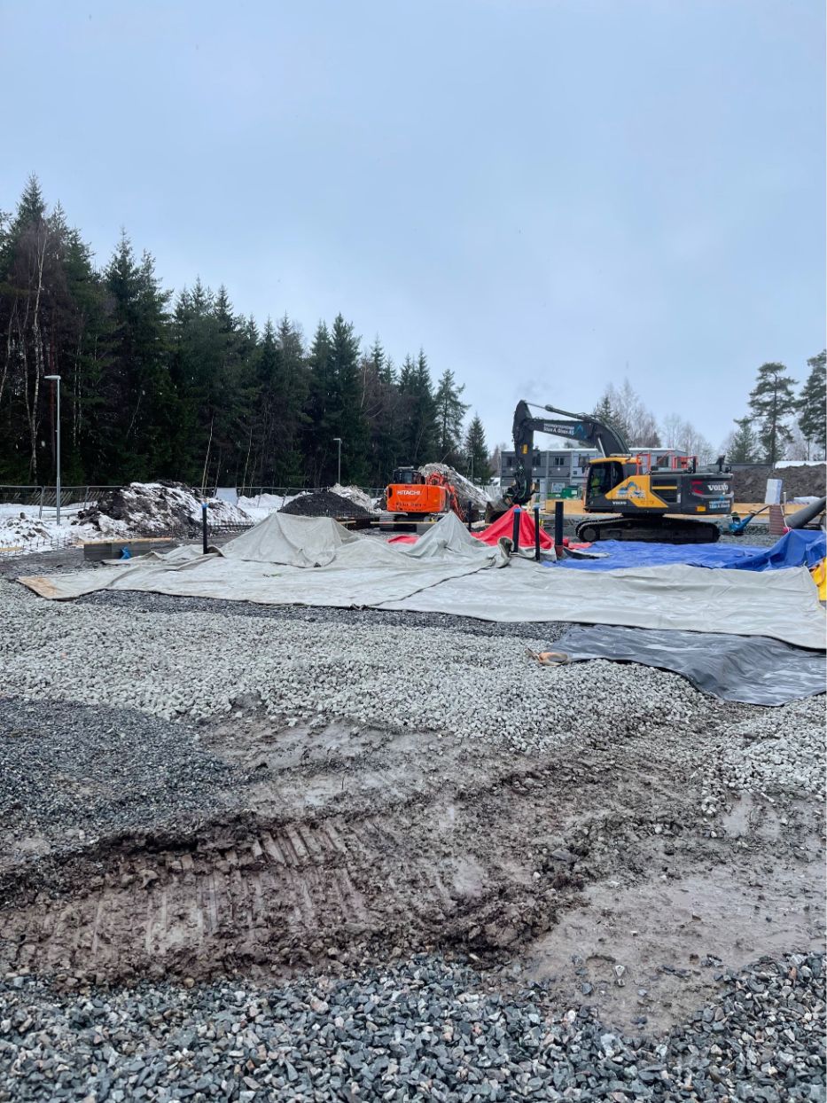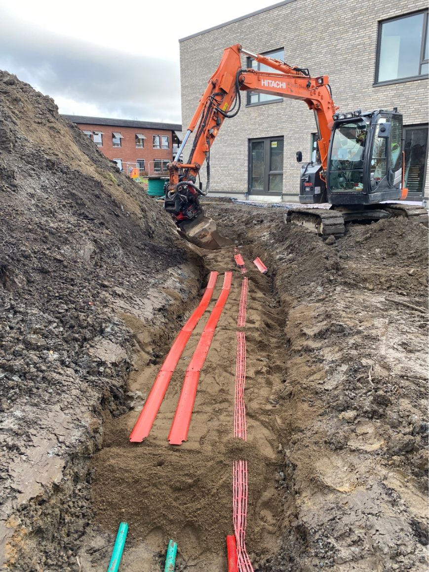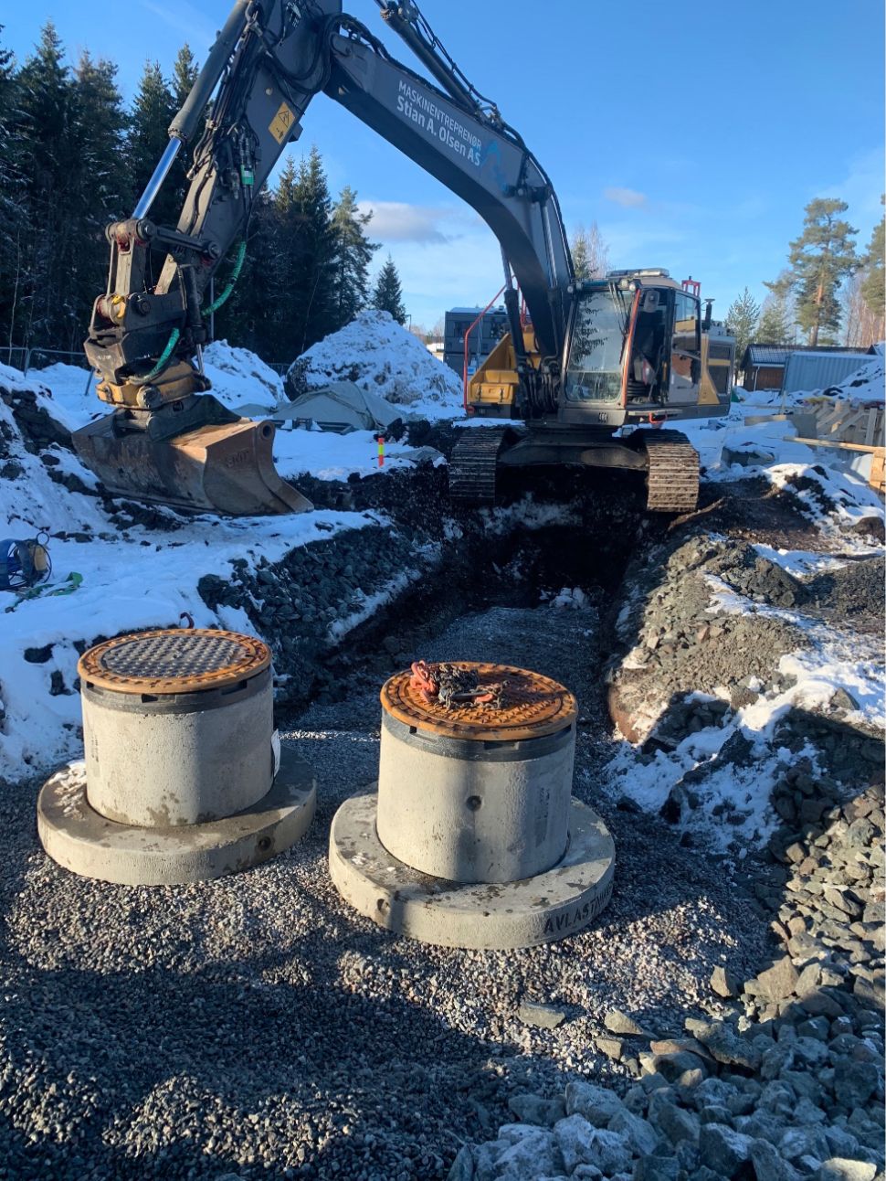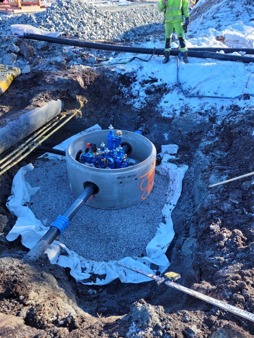 Vi har etablert komplett VA-anlegg med sandfang, overvannskummer, brannkummer og fordrøyningsanlegg. Grøfter for vann, overvann og spillvann ble gravd og tilbakefylt med pukk og sand. Ledninger ble tilkoblet kommunalt nett, og det ble utført trykktesting, kloring og kamerakjøring. Elektroarbeider inkluderte kabelgrøfter, lysmastfundamenter og ladesøyle. Fjernvarmegrøft ble etablert med isolering, og innmåling av VA-anlegg ble utført i henhold til kommunale krav.