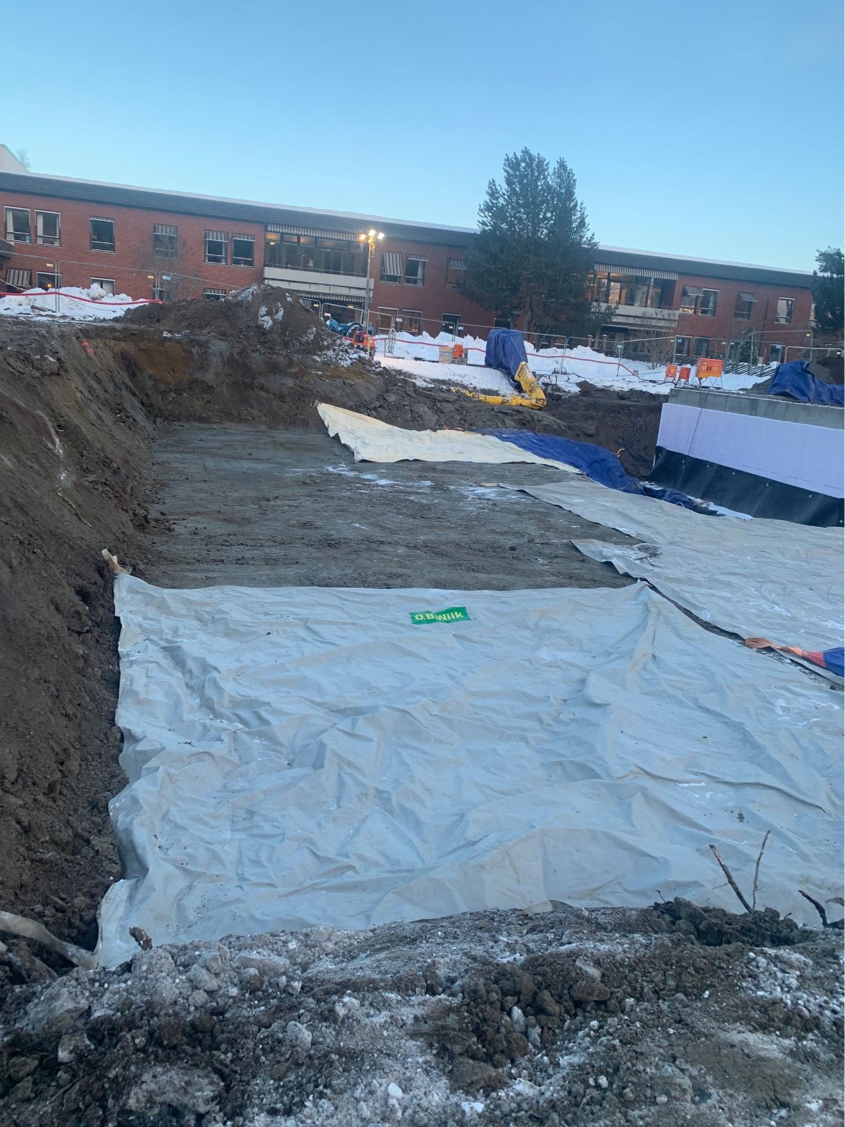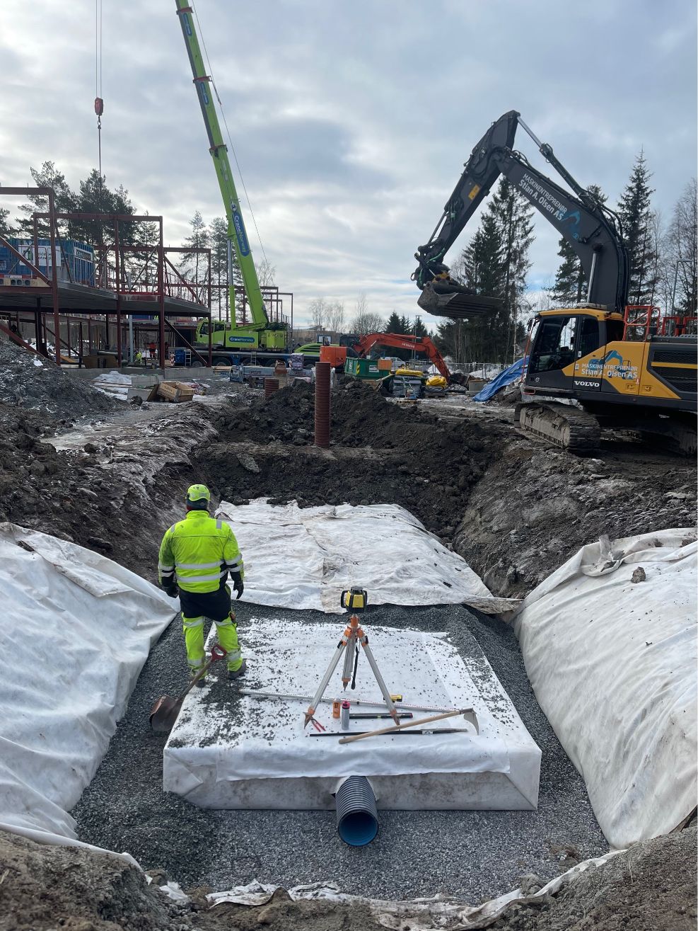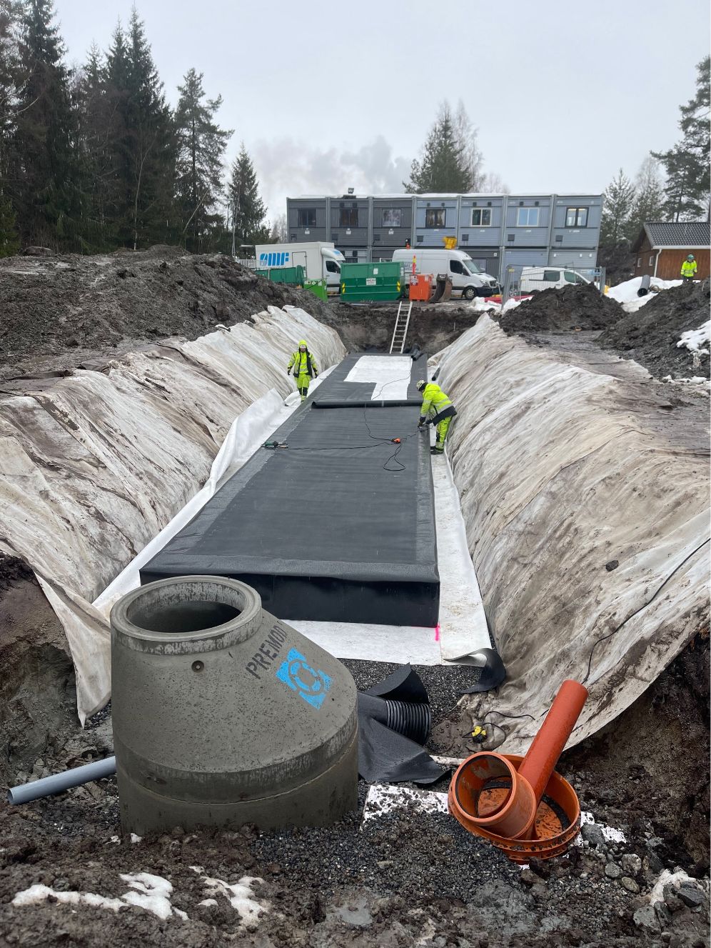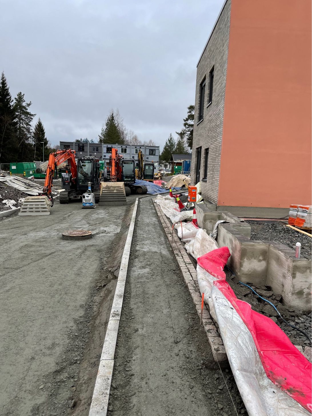 Vi har etablert komplett VA-anlegg med sandfang, overvannskummer, brannkummer og fordrøyningsanlegg. Grøfter for vann, overvann og spillvann ble gravd og tilbakefylt med pukk og sand. Ledninger ble tilkoblet kommunalt nett, og det ble utført trykktesting, kloring og kamerakjøring. Elektroarbeider inkluderte kabelgrøfter, lysmastfundamenter og ladesøyle. Fjernvarmegrøft ble etablert med isolering, og innmåling av VA-anlegg ble utført i henhold til kommunale krav.