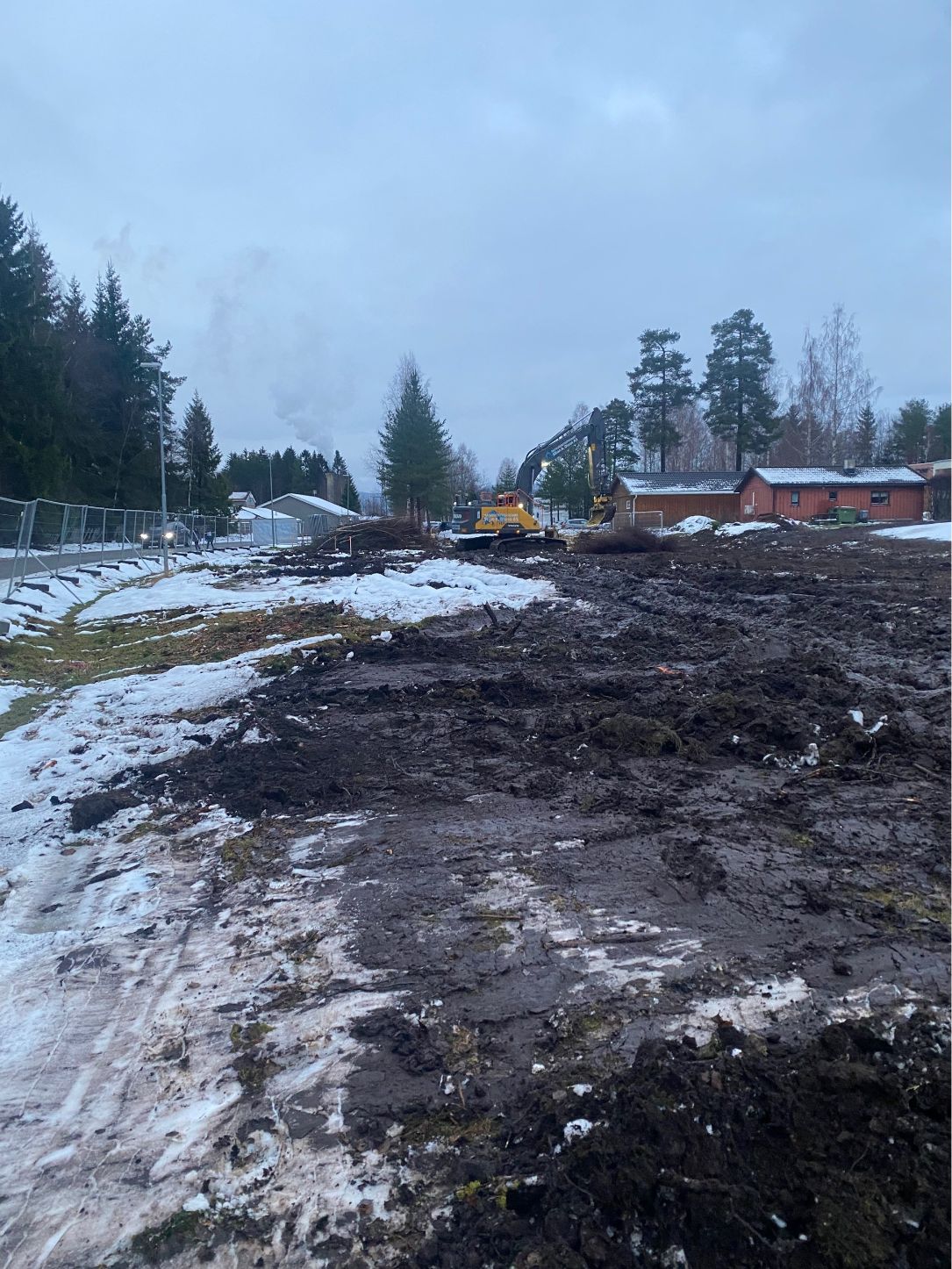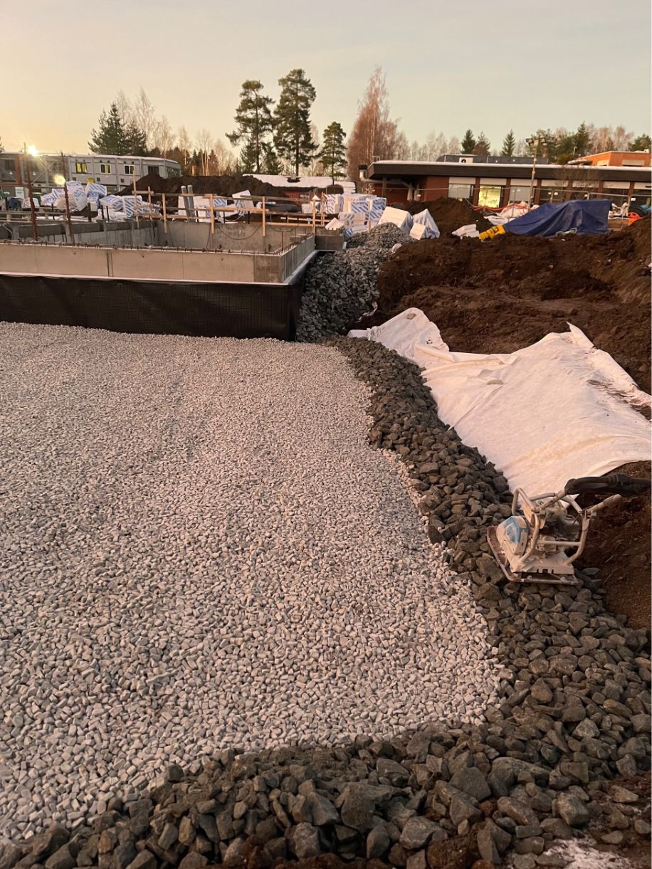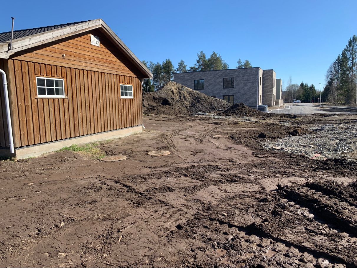 Vi startet med tilrigging av maskiner og etablering av riggområde, inkludert stikking og oppmåling. Trafikkavvikling og renhold av offentlige veier ble ivaretatt gjennom hele anleggsperioden. Tomten ble ryddet og klargjort med fjerning av vegetasjon, stubber og matjord, før utgraving og massehåndtering for byggegrop og fundamenter ble gjennomført. Vi la fiberduk og opprettet bærelag og gulv på grunn med tilførte grusmasser. Bunnledninger ble gravd og tilbakefylt, og drenering rundt kjeller ble etablert.