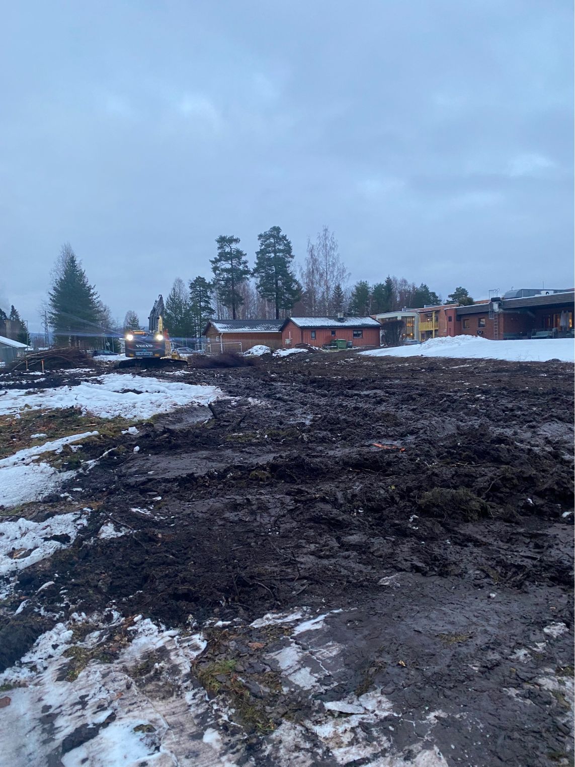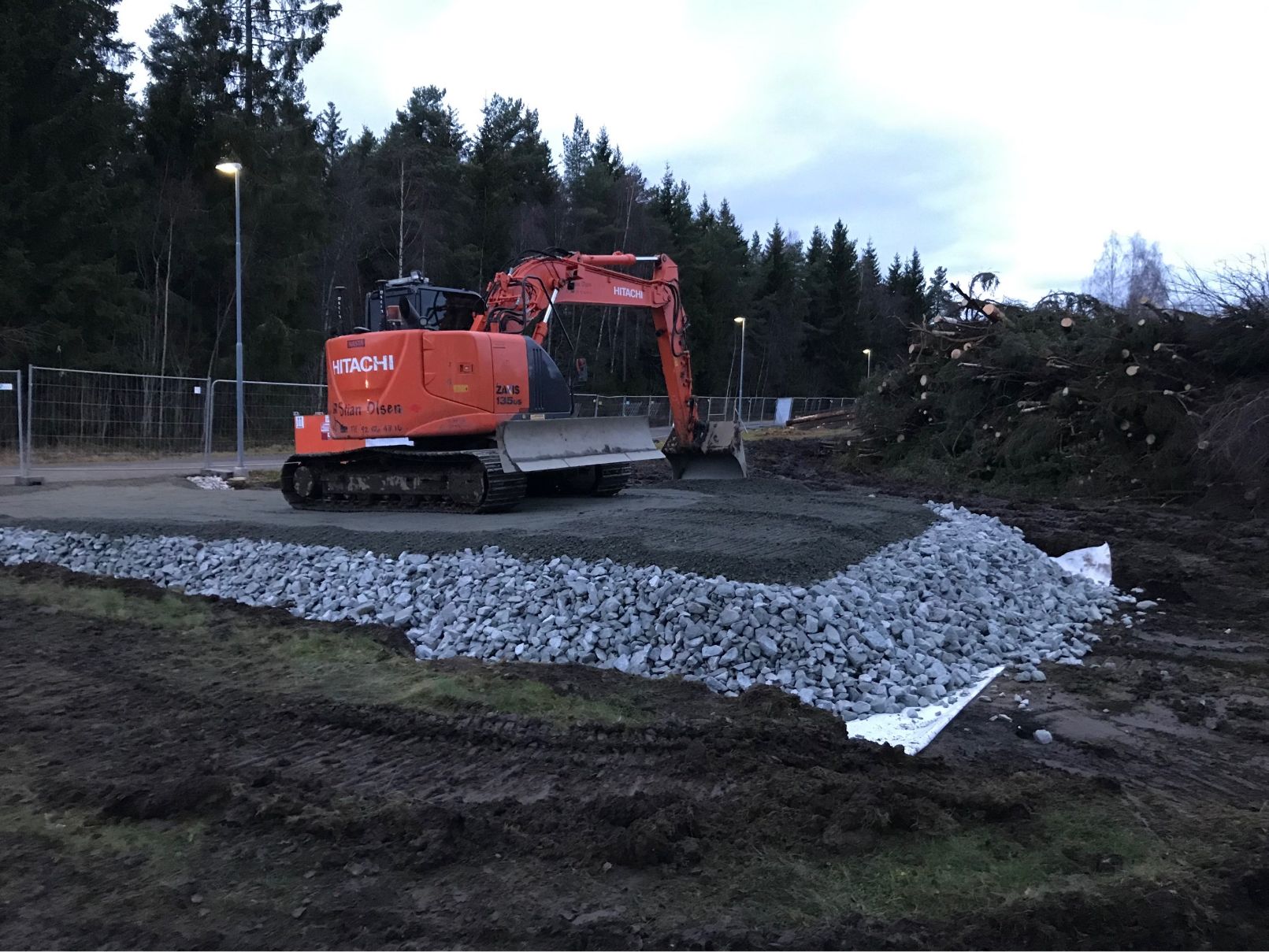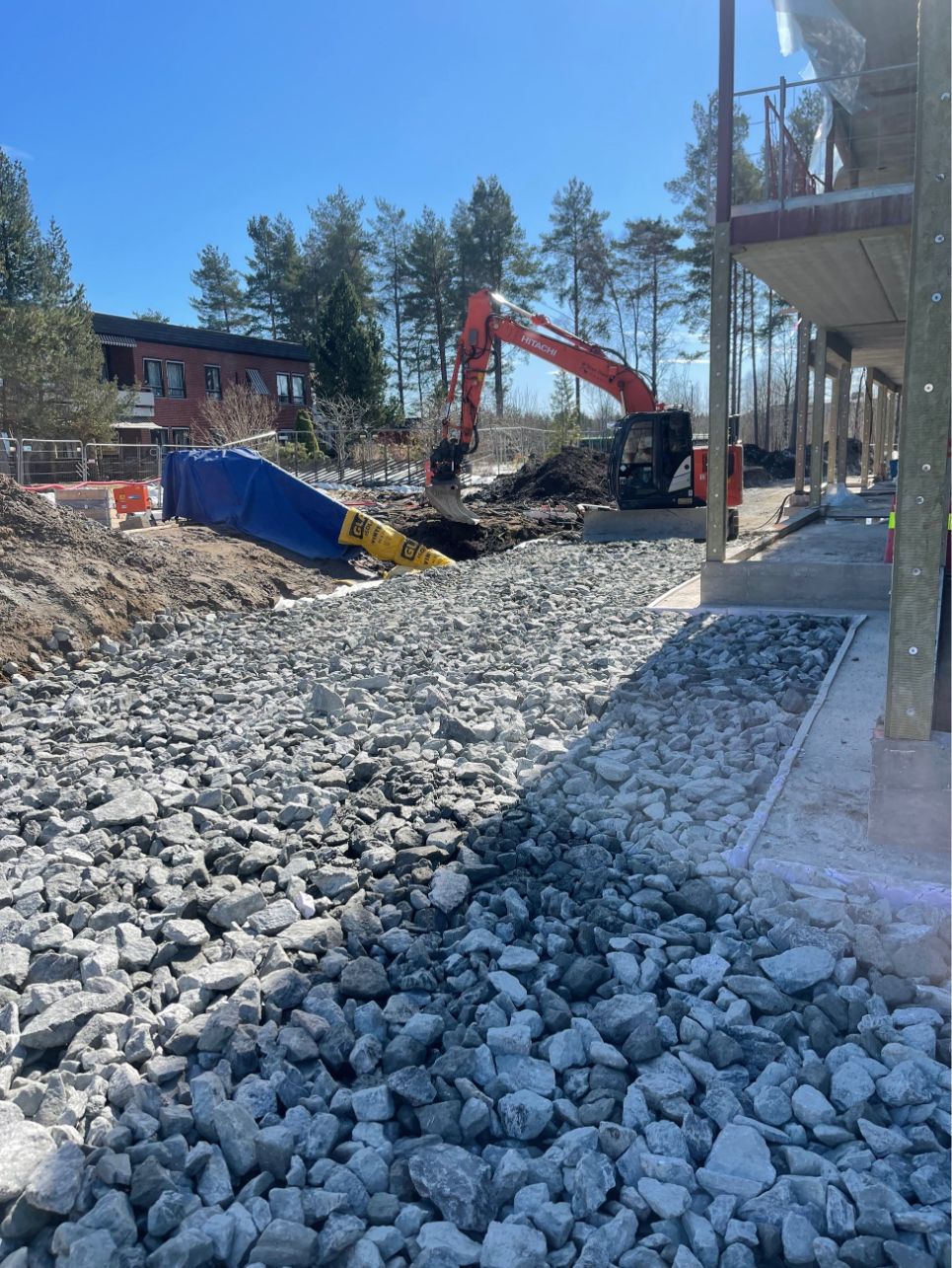 Vi startet med tilrigging av maskiner og etablering av riggområde, inkludert stikking og oppmåling. Trafikkavvikling og renhold av offentlige veier ble ivaretatt gjennom hele anleggsperioden. Tomten ble ryddet og klargjort med fjerning av vegetasjon, stubber og matjord, før utgraving og massehåndtering for byggegrop og fundamenter ble gjennomført. Vi la fiberduk og opprettet bærelag og gulv på grunn med tilførte grusmasser. Bunnledninger ble gravd og tilbakefylt, og drenering rundt kjeller ble etablert.