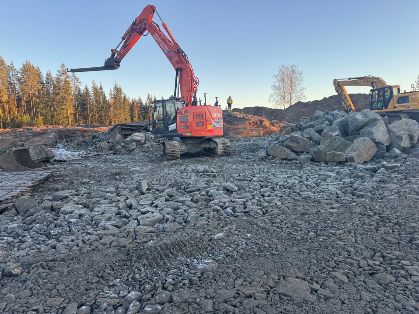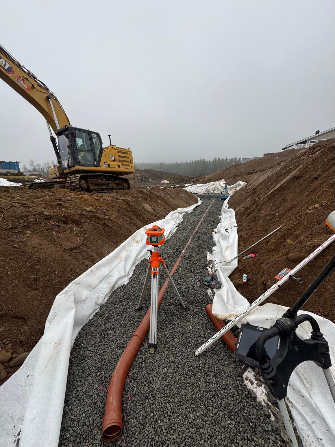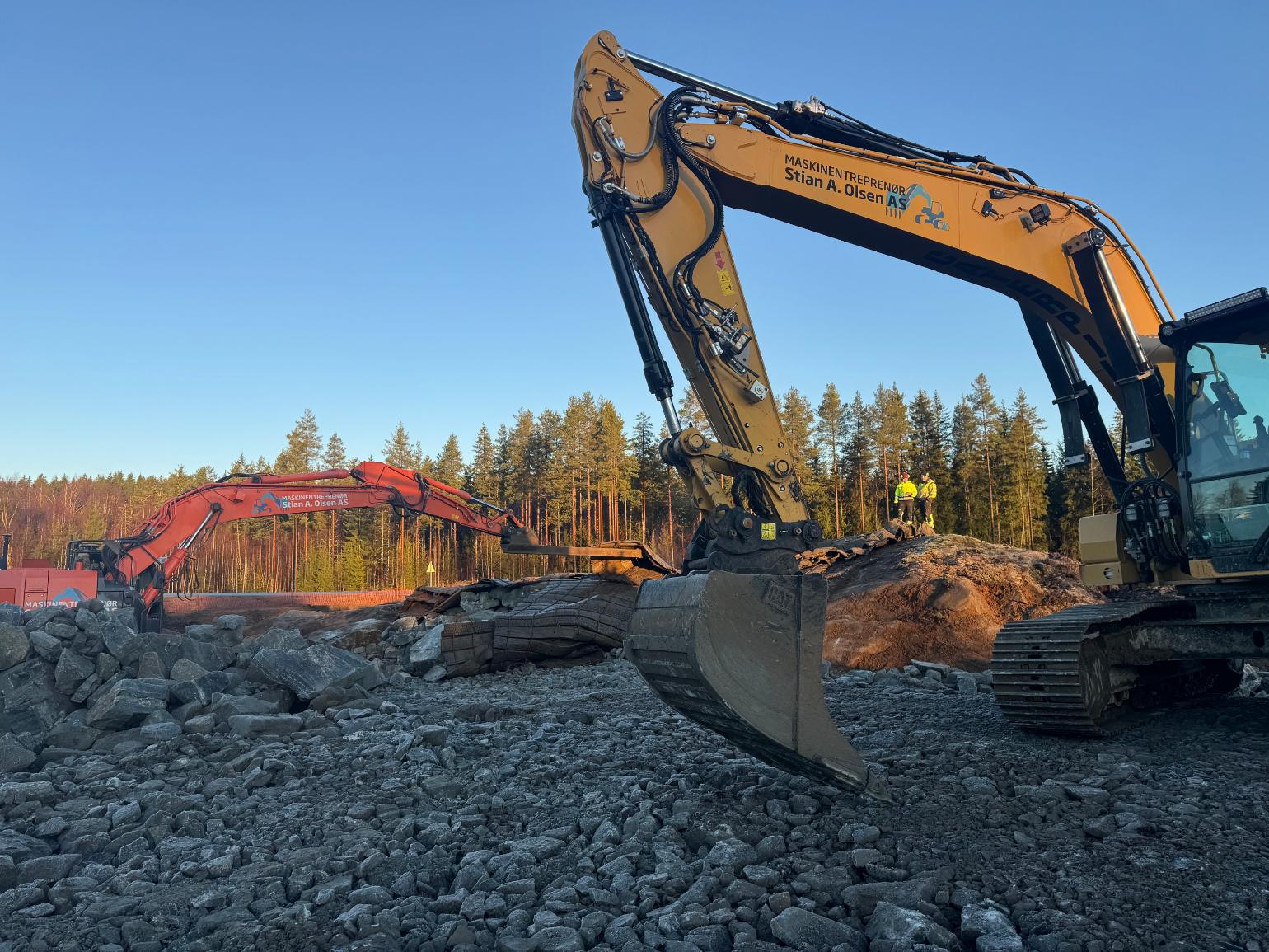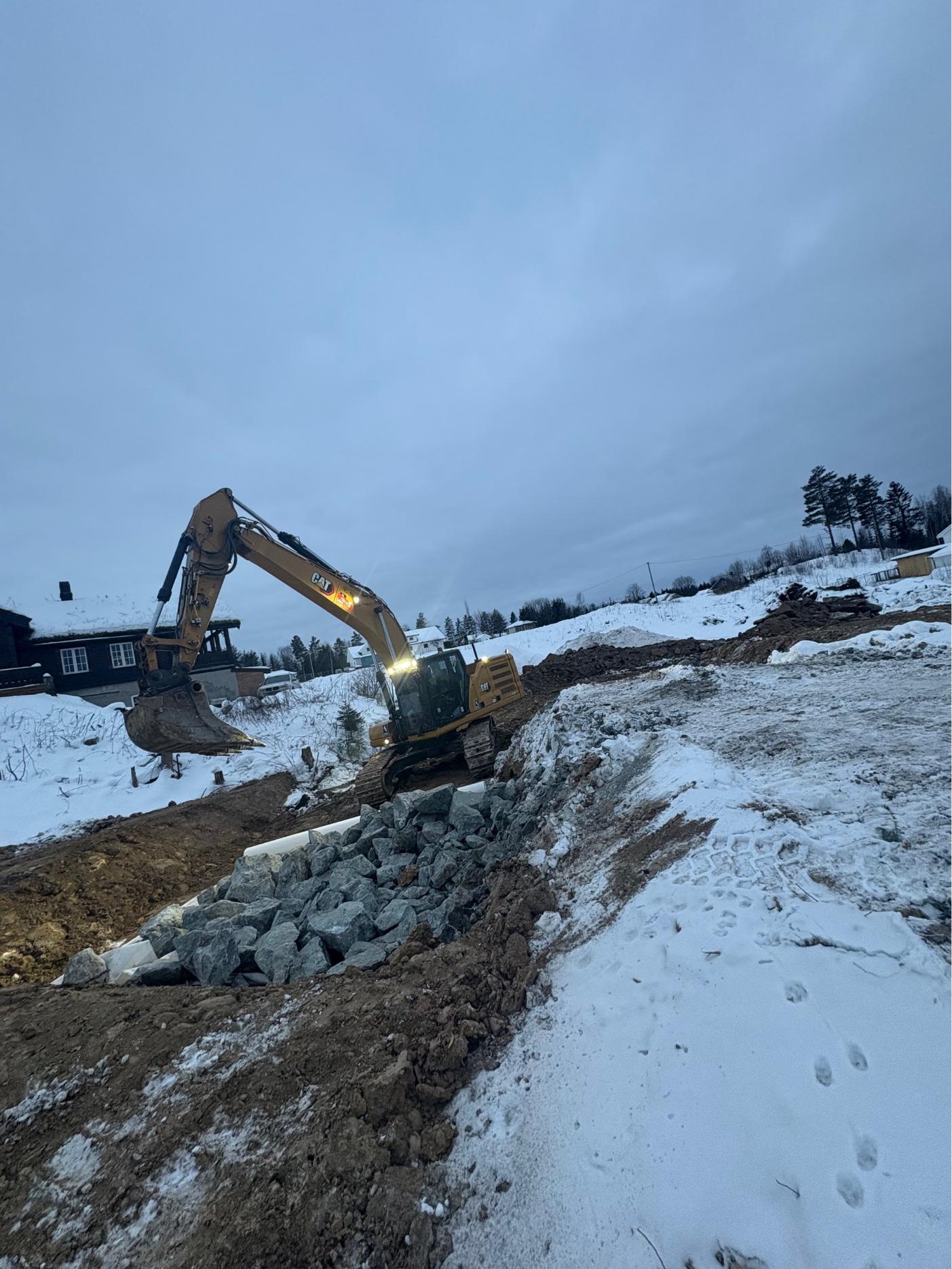 Før terrenginngrep starter skal vi rydde og klargjøre tomten, inkludert felling av trær, rydding av buskas og håndtering av hogstavfall. Vekstjord flyttes til ranker for midlertidig lagring. Deretter gjennomfører vi graving til generelle nivåer for bygg, veier og øvrig infrastruktur, samt massehåndtering og transport både internt og eksternt. Grunnarbeidet omfatter også oppbygging av fyllinger, etablering av bærelag og bruk av geotekstil der masser og trafikkbelastning krever det.