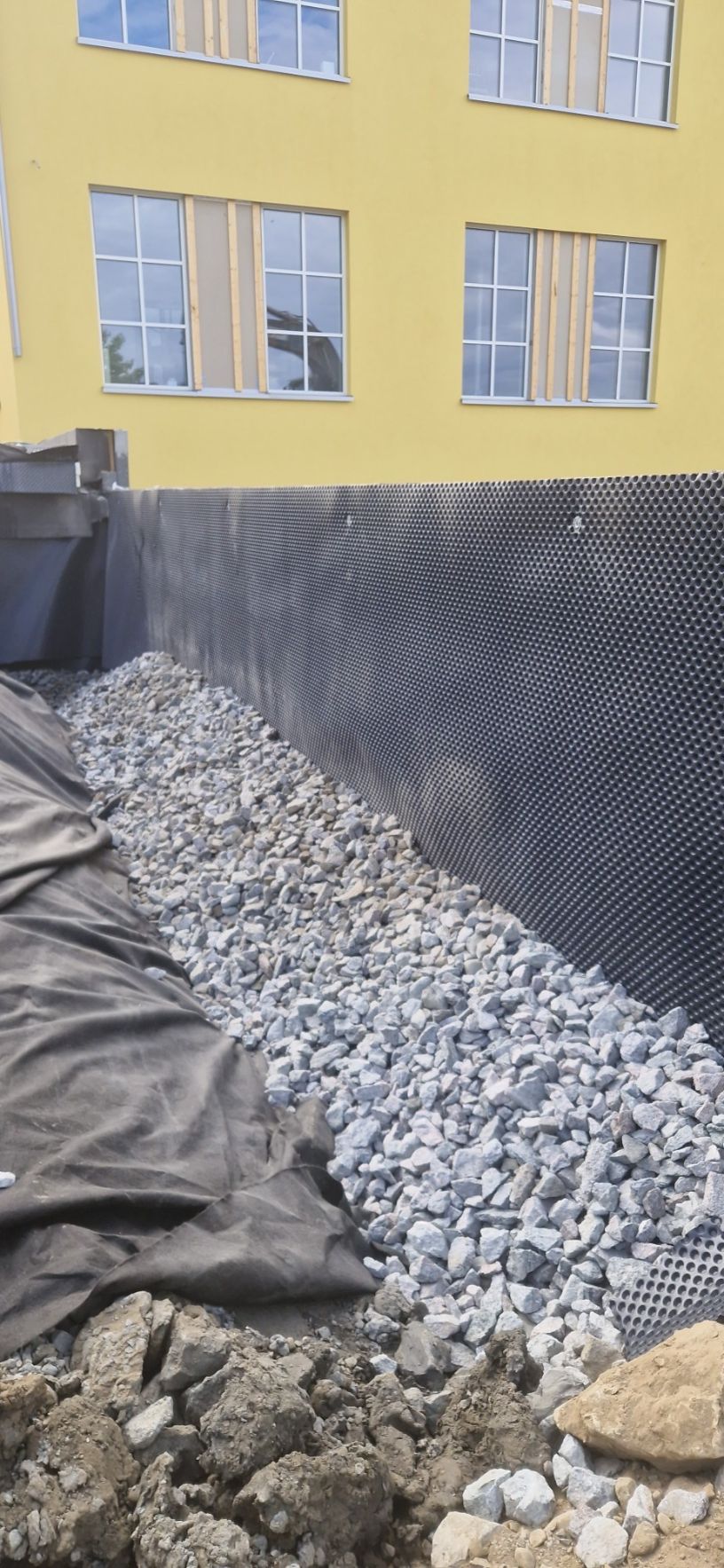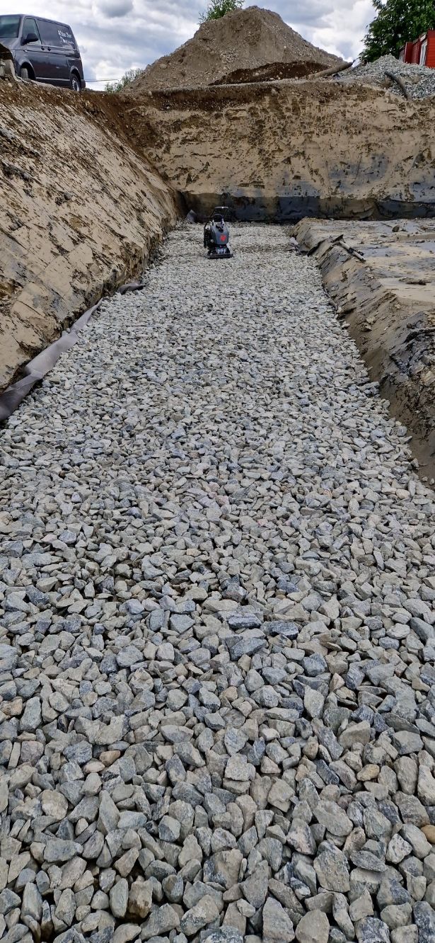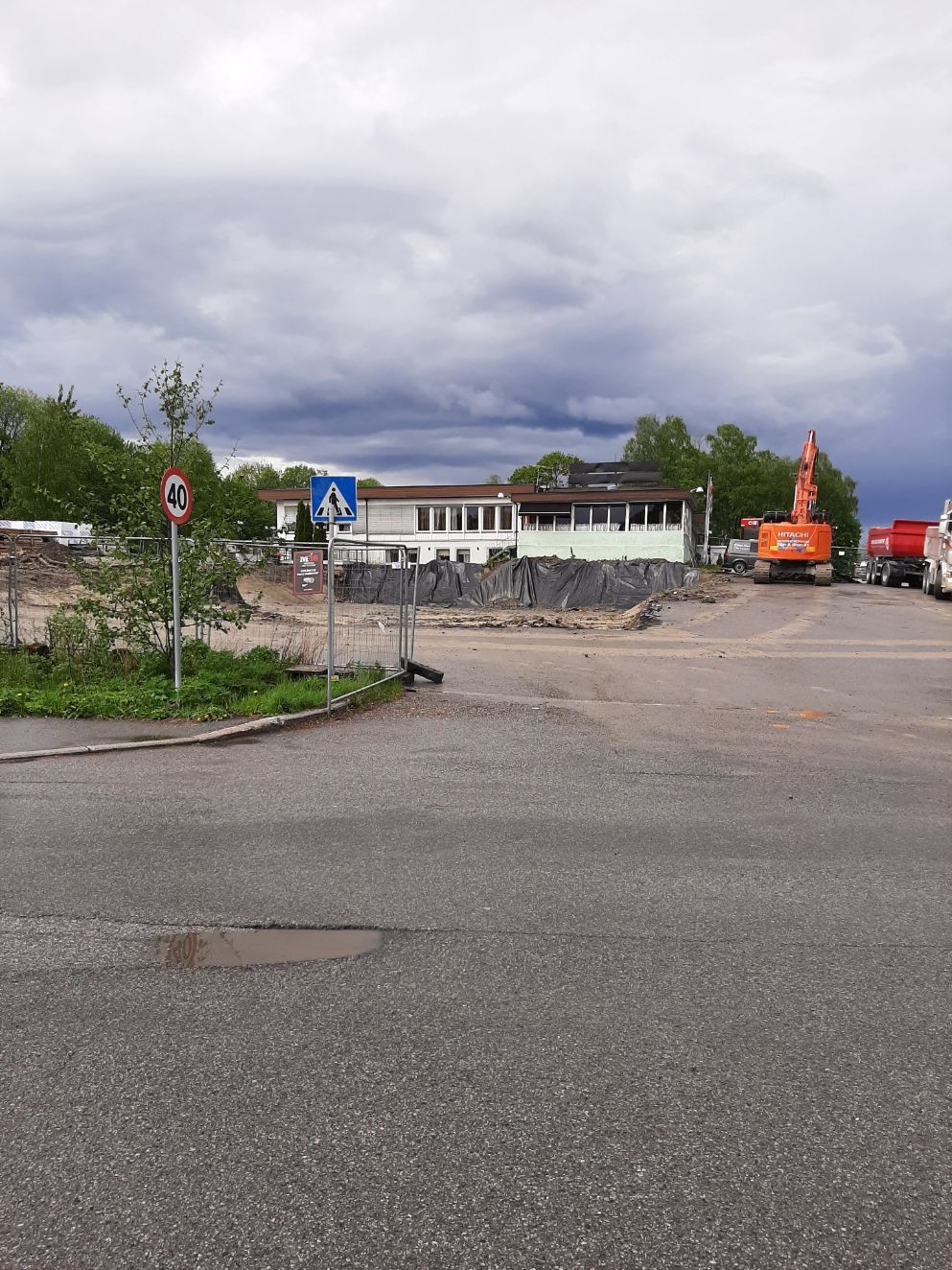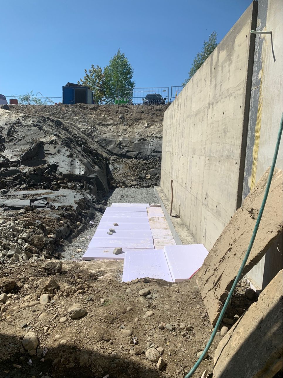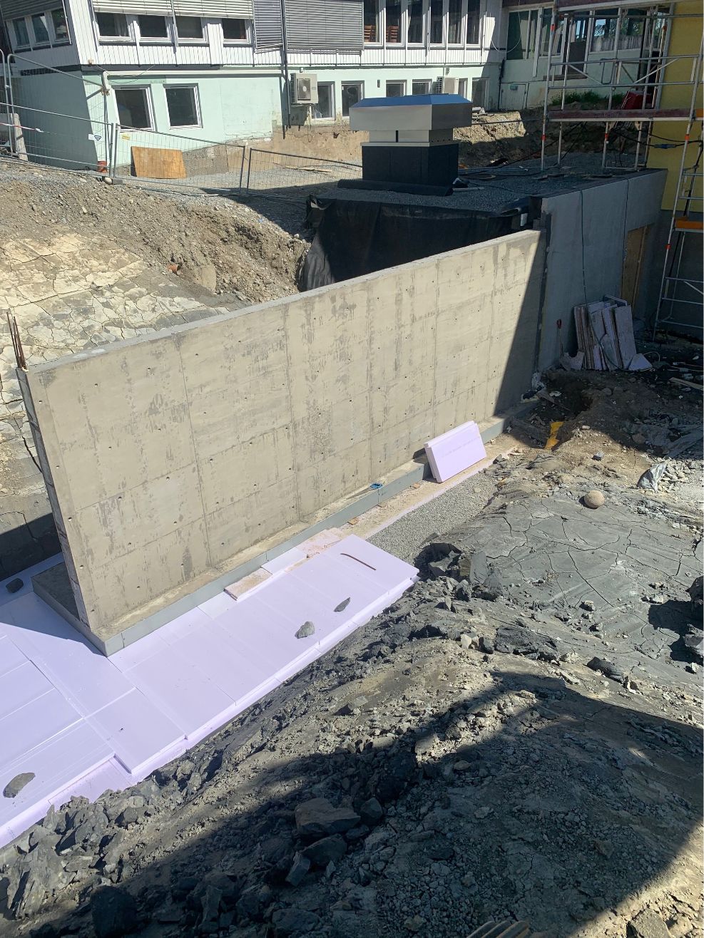 Eksisterende asfalt ble fjernet og levert til godkjent mottak. Byggegropen på 600 m² ble gravd til riktig kotehøyde og massene kjørt til deponi. Vi utførte graving til fundamenter, bunnledninger og drenering rundt bygget, inkludert tilbakefylling og isolering med XPS. Fiberduk ble lagt i byggegropen, og fundamenter og underlag for betongstøp ble opparbeidet.